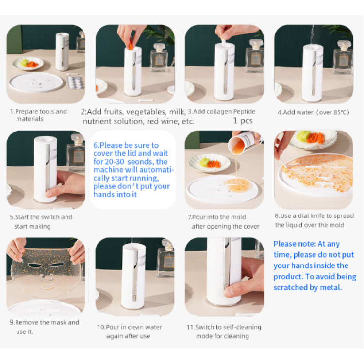 Апарат для створення зволожуючих масок для шкіри на основі натуральних інгредієнтів. Виготовлення масок залежить від типу вашої шкіри, ви можете зробити різні види масок для обличчя, наливаючи сік фруктів та овочів, або чай, молоко, мед, пиво та червоне вино, ефірні олії, трави, квіти, і т.д.