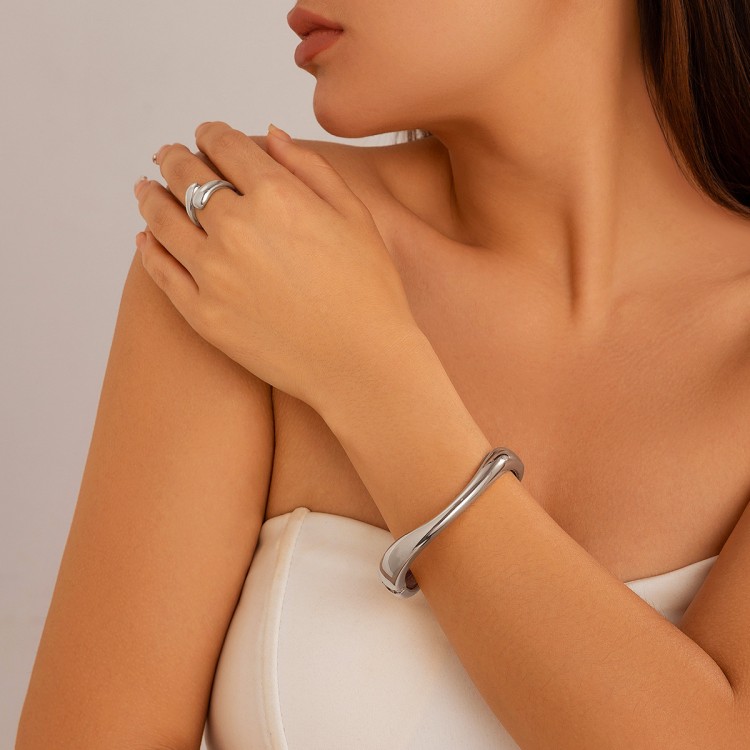 Елегантний браслет із унікальним вигином, що символізує грацію та стиль. Виконаний із високоякісного металу із золотистим покриттям, цей аксесуар стане вишуканим доповненням до вашого образу.