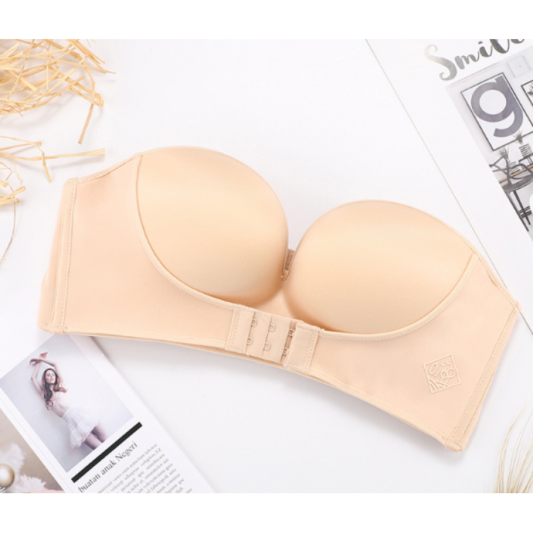 Бюстгальтер безшовний, без бретельок, гладкий, без кісточки, з PUSH UP ефектом. Зворотний бік шлейки з силіконом проти ковзання та сповзання. Подвійна застібка спереду та потрійна застібка ззаду. Бюстгальтер максимально відтворює природну форму грудей: піднімає їх та не стискає.