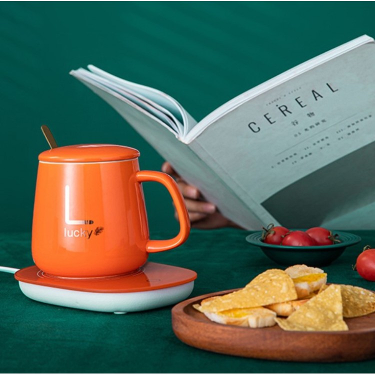 Чашка керамічна оранжева з підставкою - підігрівом, зарядкою USB і ложечкою в упаковці-пакеті