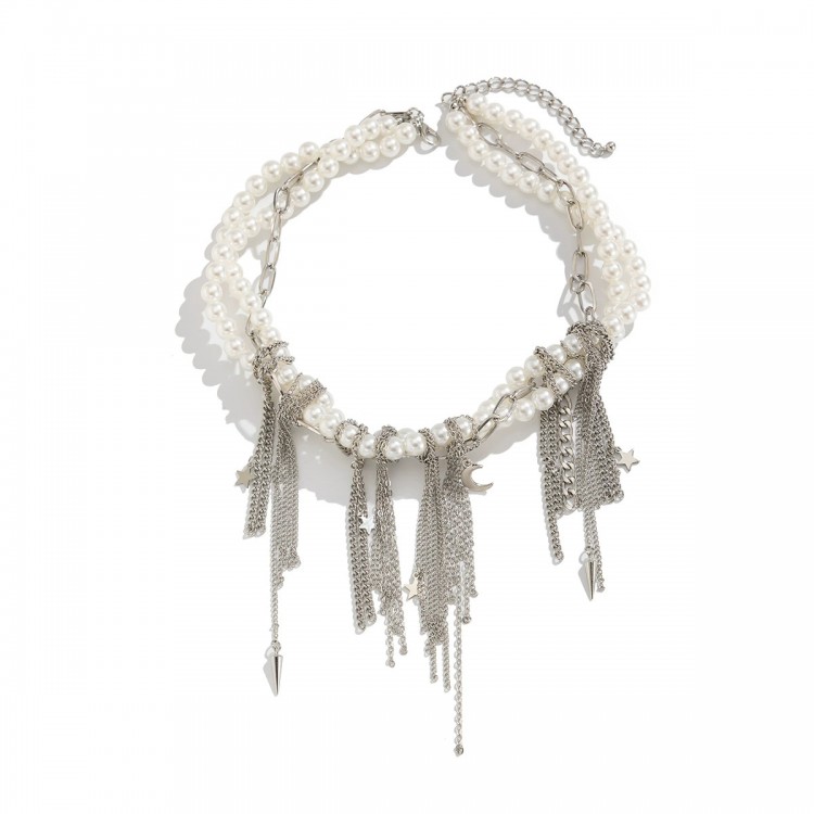 Цей витончений аксесуар об'єднує перли і сріблясті ланцюжки, створюючи унікальну гармонію класичного і сучасного стилів. Ланцюжки з підвісками у вигляді місяця і шипів додають загадковості вашому образу.