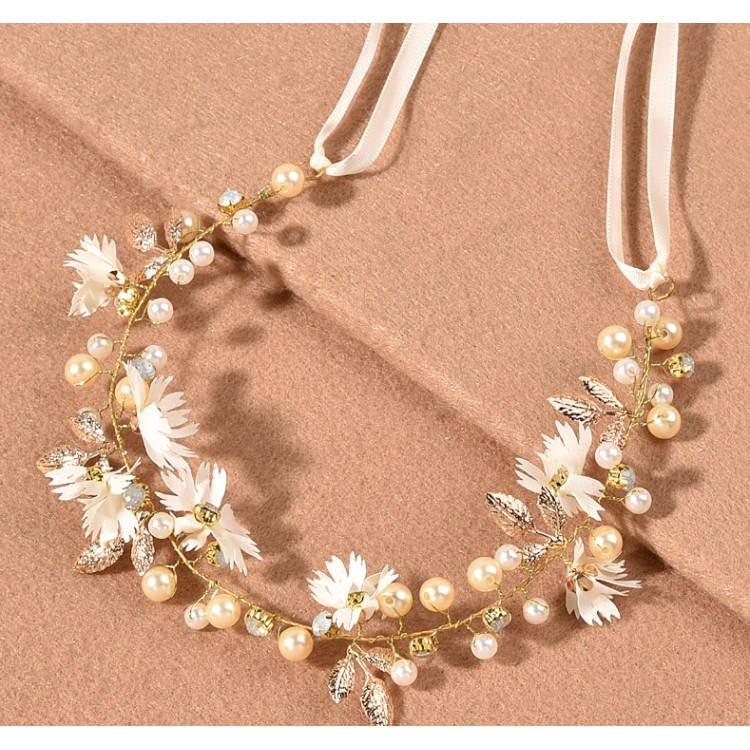 Тендітний та ніжний віночок з квітами та перлинами, представлений у кольорі золото, дуже гарно виглядає на будь-яких зачісках. Буде чудовою прикрасою для вечірнього виходу. Віночок гнучкий, йому можна надати будь-якої форми у зачісці, а також, доповнити додатковими шпильками чи іншими аксесуарами. Доповнений атласними стрічками.