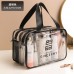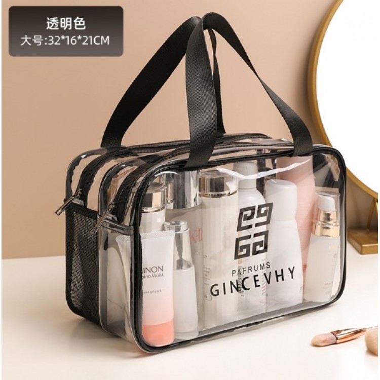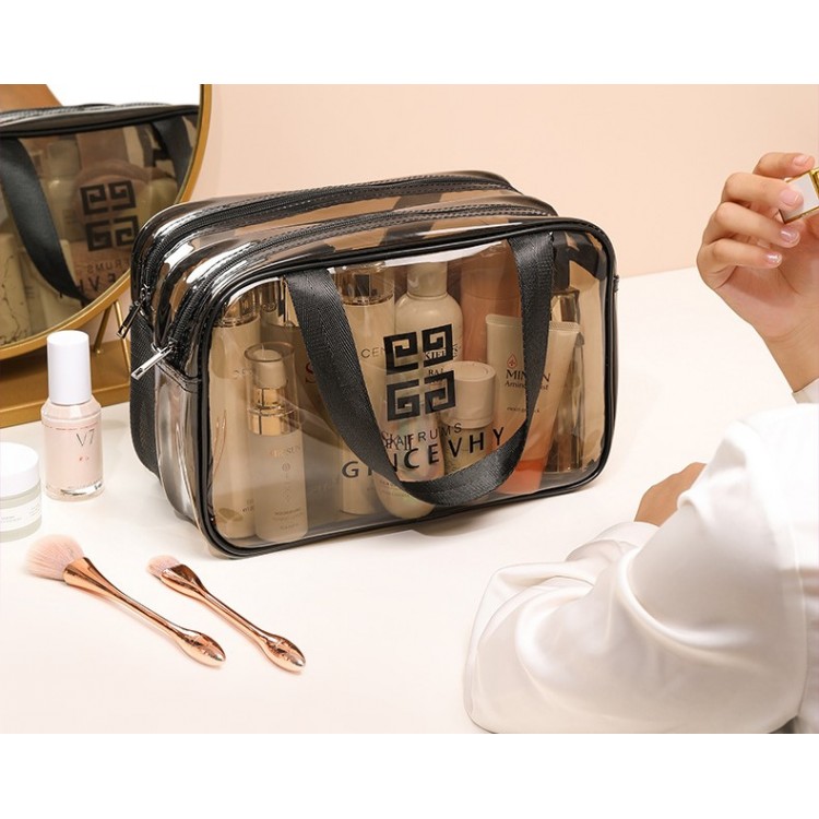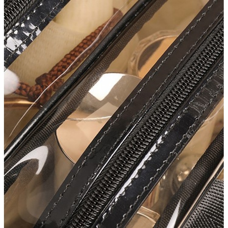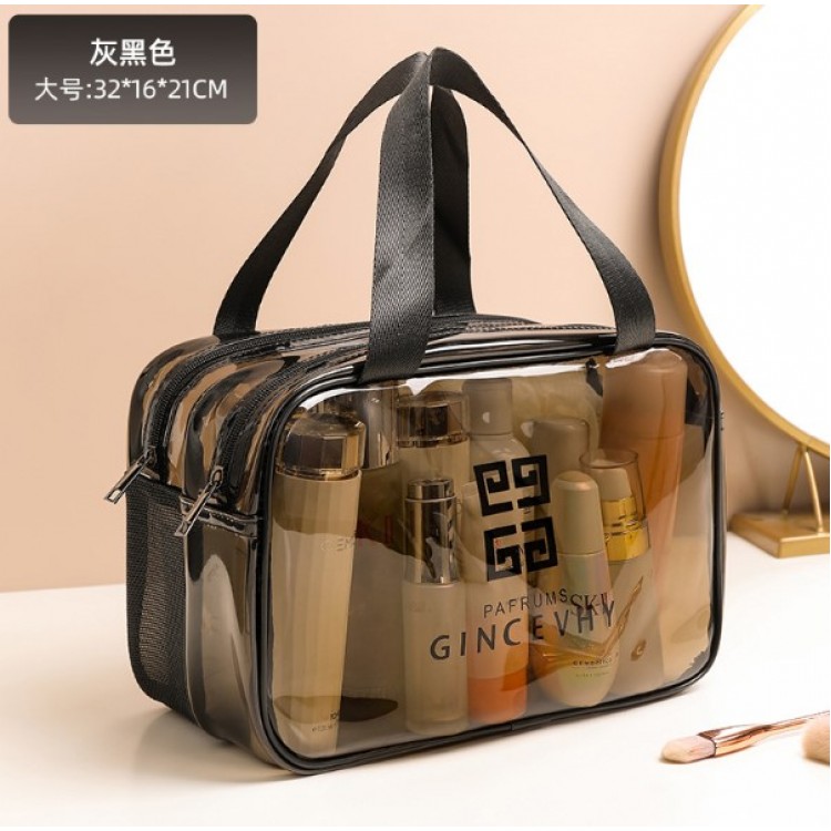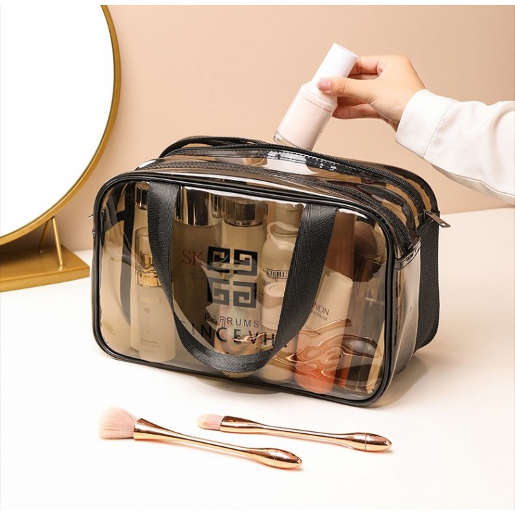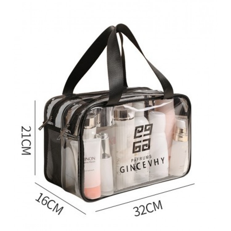 Ця сумка-косметичка виконана з якісного прозорого матеріалу, компактна, має два відділення, що закриваються на блискавку. Для зручного перенесення є ручки. Водонепроникна, що зручно, адже зайва рідина не потрапить всередину. Великим плюсом сумки є її прозорість, що дозволяє швидко знайти потрібний предмет, не переглядаючи вміст.