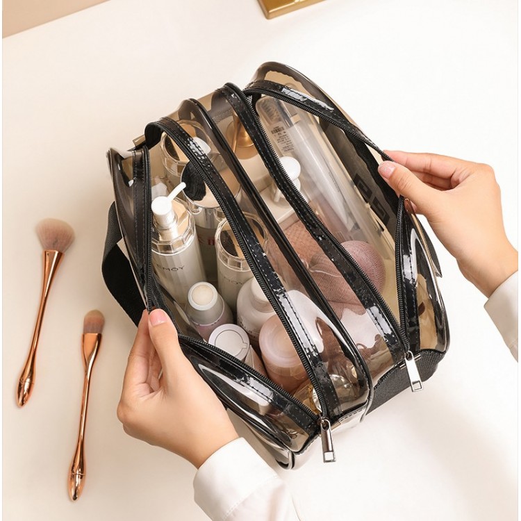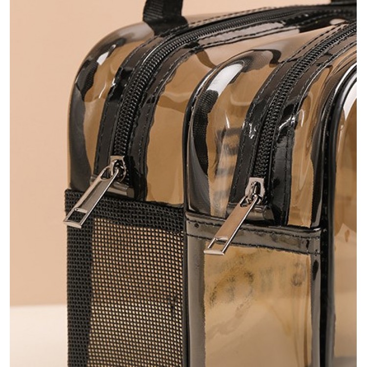 Ця сумка-косметичка виконана із якісного прозорого матеріалу, компактна, має два відділення, що закриваються на блискавку. Для зручного перенесення є ручки. Водонепроникна, що зручно, адже зайва рідина не потрапить всередину. Великим плюсом сумки є її прозорість, що дозволяє швидко знайти потрібний предмет, не переглядаючи вміст.