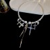 Прикраса має блискучі перли з кількома сріблястими підвісками-хрестиками різного розміру, кожна з яких вишукано деталізована та прикрашена кристалами.