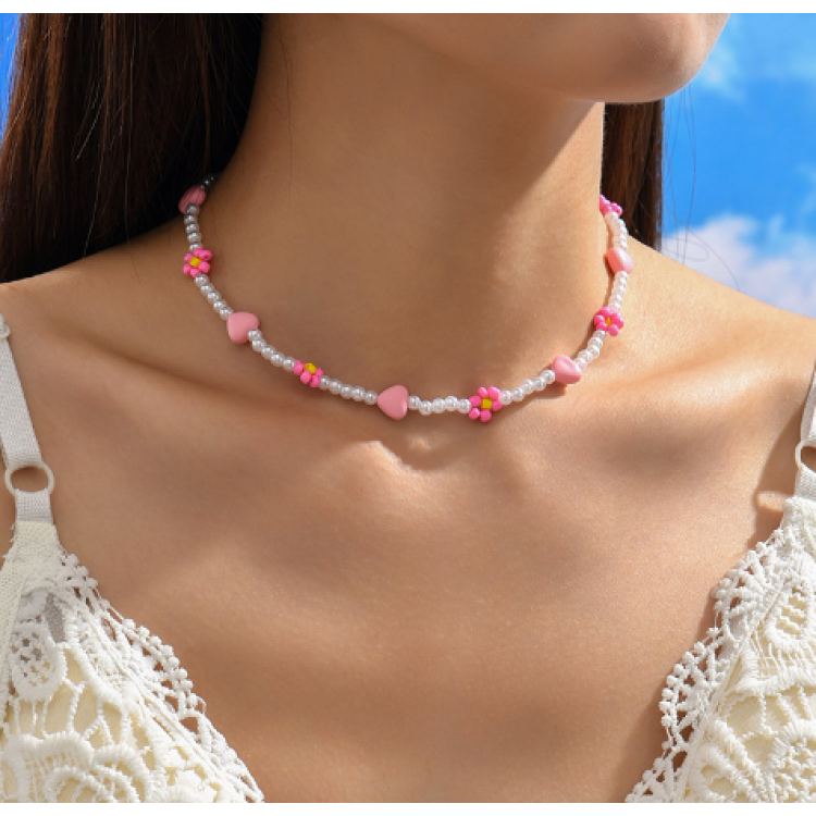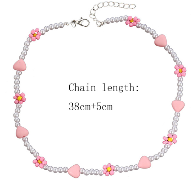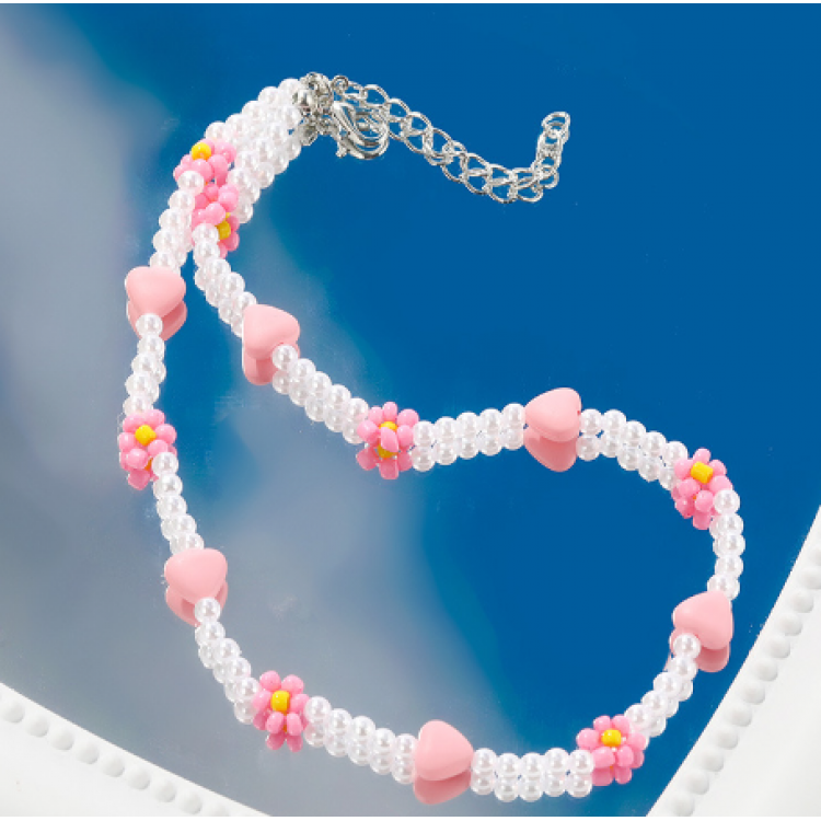 Ланцюжок із перлів з рожевими ромашками та сердечками "Dream One", 38+5 см