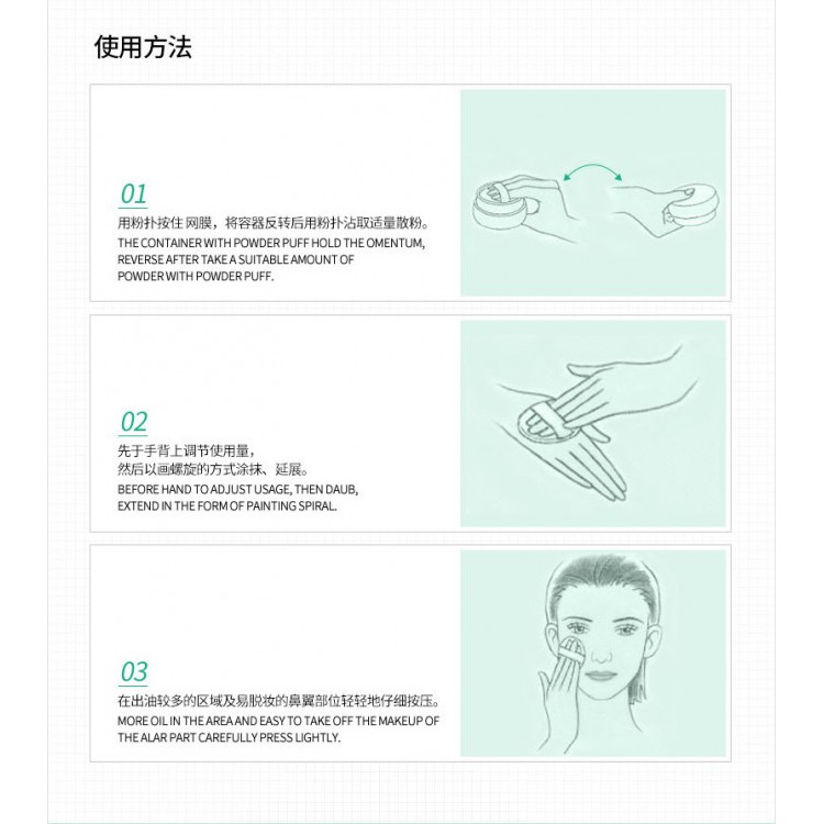 Пудра дуже дрібного млива, безбарвна, з ненав'язливим м'ятним ароматом. Чудово матує жирну шкіру на тривалий проміжок часу, забезпечуючи шкірі фарфоровий зовнішній вигляд. Наносити на шкіру спеціальним пензлем або м'яким пушком, яким пудра комплектується. Підходить для всіх типів шкіри, але особливо жирної.