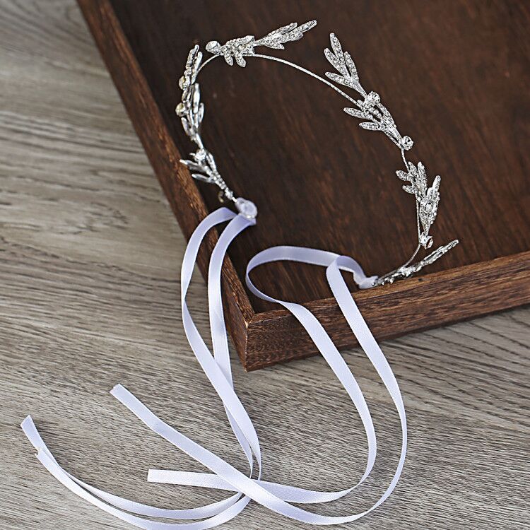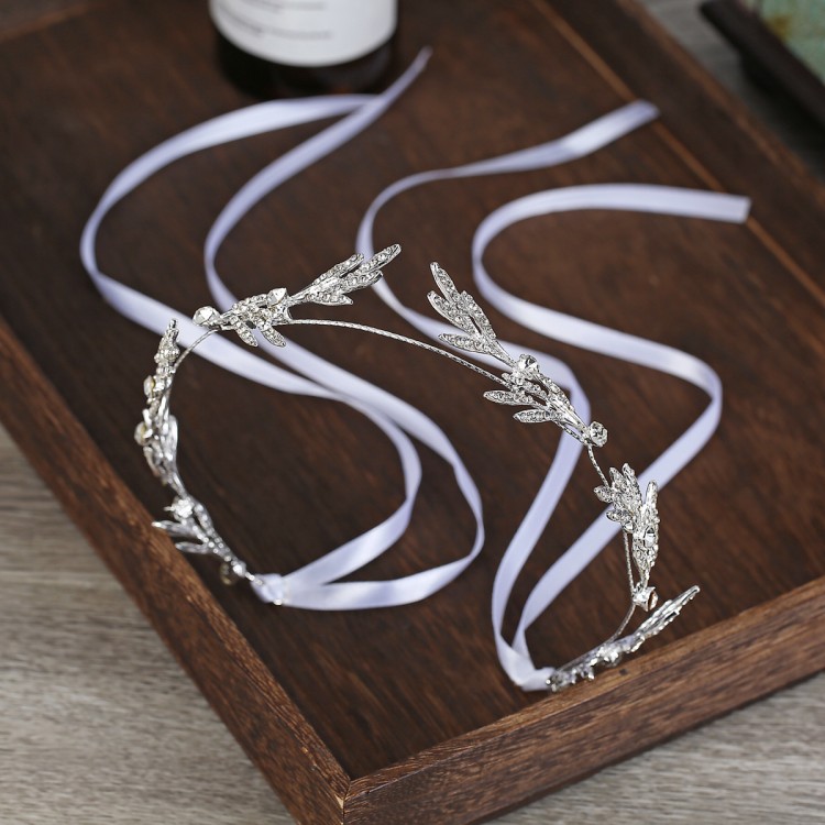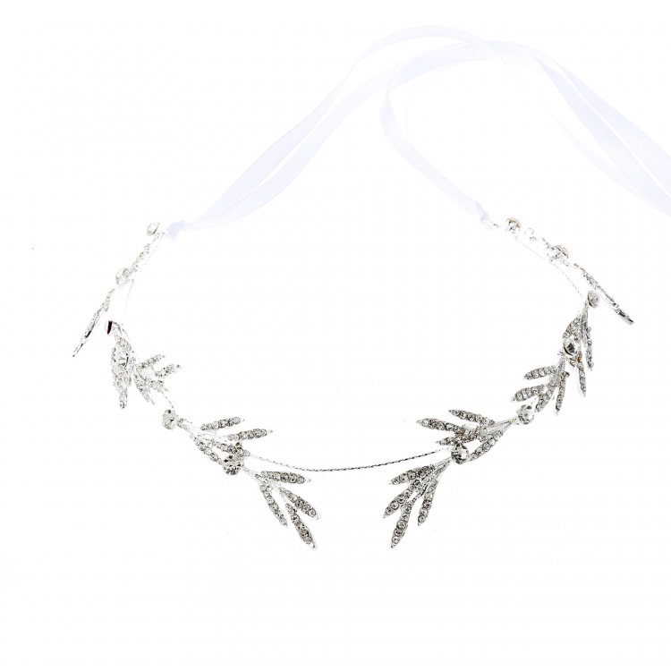 Обруч для волосся зі стразами та атласними стрічками "White Lines", прикраса на голову, срібло