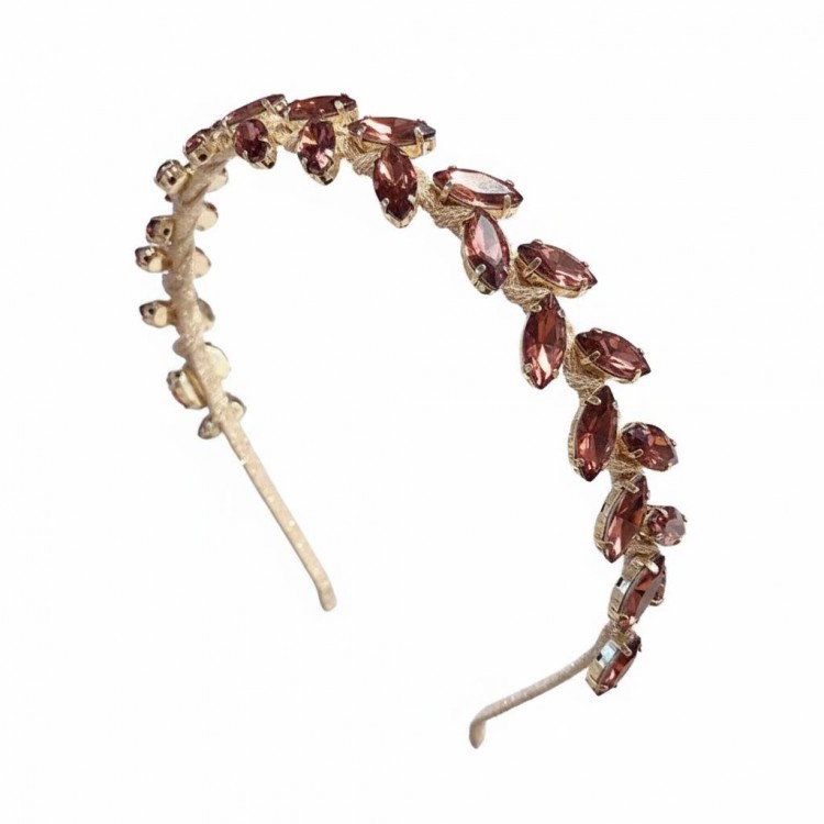 Обруч для волосся “Burgundy Shine” зі стразами та камінням у формі листя – це витончена прикраса, яка додає образу елегантності та розкоші. Обруч виконаний у світлому бургундовому відтінку, що поєднує благородний червоний з відтінками вишневого, ідеально підкреслює жіночність та ніжність. Його дизайн натхненний стилем бароко та грецькою естетикою: металеві листочки акуратно викладені з камінням і стразами, створюючи враження тонкої ручної роботи та високої майстерності.