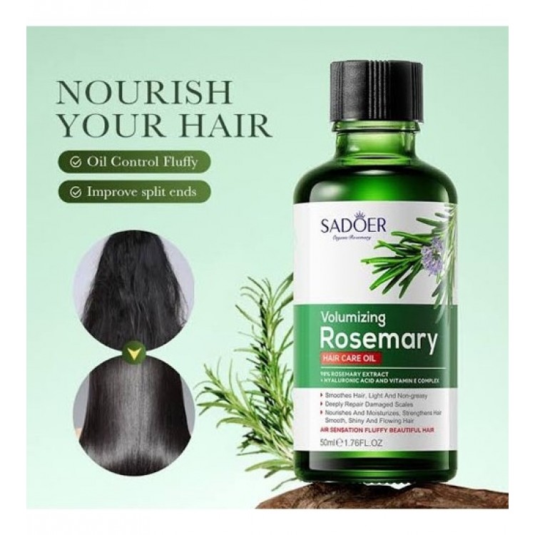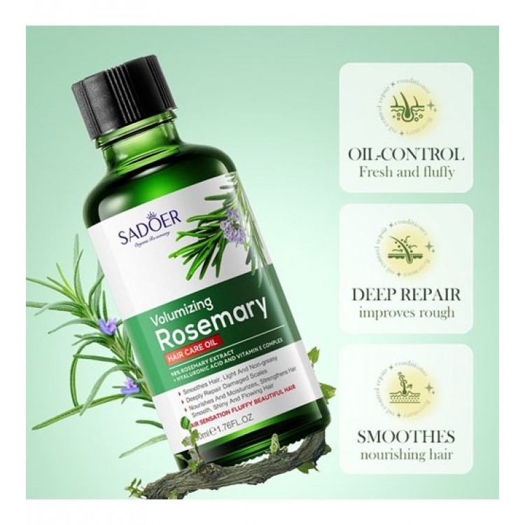 Масло для догляду за волоссям Sadoer з екстрактом розмарину забезпечує об'єм, легкість та глибоке живлення. Завдяки 98% екстракту розмарину, гіалуроновій кислоті та комплексу вітаміну Е, цей засіб відновлює пошкоджене волосся, надає йому гладкість і сяйво, зміцнює кожну волосину від кореня до кінчика. Природні компоненти підтримують здоров'я волосся та забезпечують повітряний об'єм без відчуття жирності.