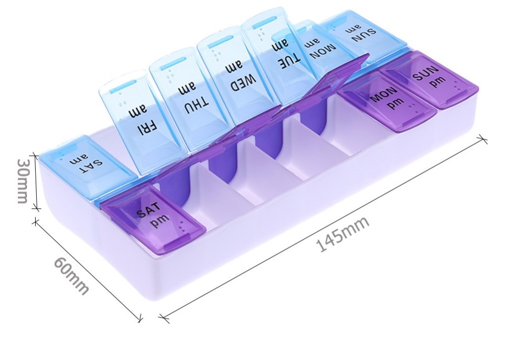 Місткий контейнер, розміром із невеликий сучасний планшет, для роздільного зберігання порцій таблеток. Виготовлений з матового пластику і є акуратною плоскою коробочкою з 28-ма відділеннями, розташованими в чотири ряди. У перших трьох зберігаються дози таблеток для регулярного прийому протягом дня. Нижній ряд призначений додаткового запасу препаратів. Кожен ряд пофарбований у свій колір: жовтий, блакитний, бузковий і рожевий. Відтінки підібрані не різкі, але добре помітні та приємні для очей.