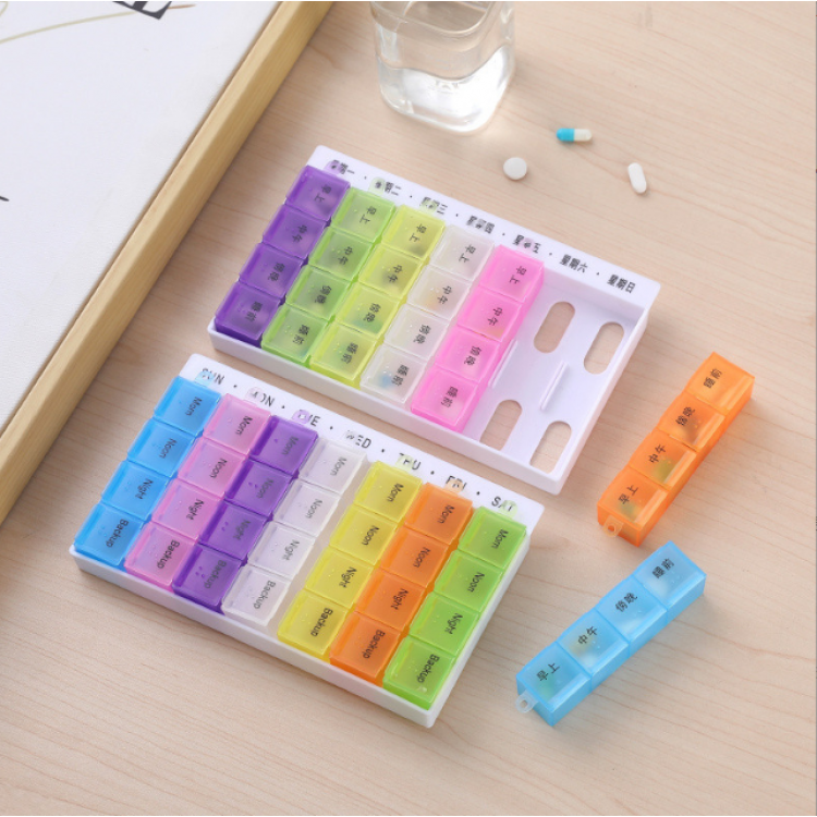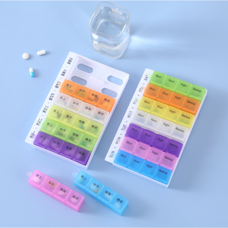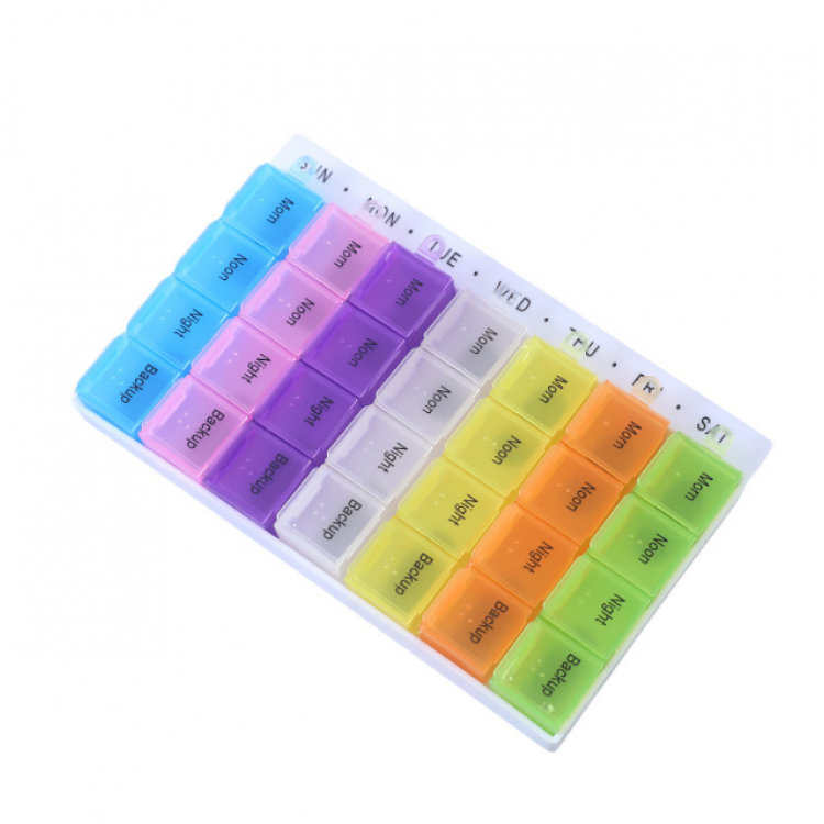 Місткий контейнер, розміром із невеликий сучасний планшет, для роздільного зберігання порцій таблеток. Виготовлений з матового пластику і є акуратною плоскою коробочкою з 28-ма відділеннями, розташованими в чотири ряди. У перших трьох зберігаються дози таблеток для регулярного прийому протягом дня. Нижній ряд призначений додаткового запасу препаратів. Кожен ряд пофарбований у свій колір: жовтий, блакитний, бузковий і рожевий. Відтінки підібрані не різкі, але добре помітні та приємні для очей.
