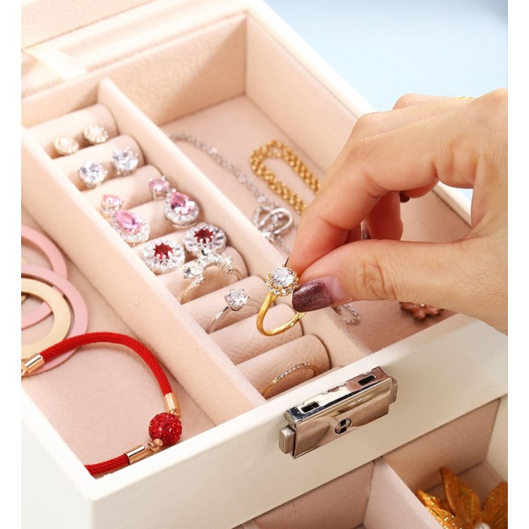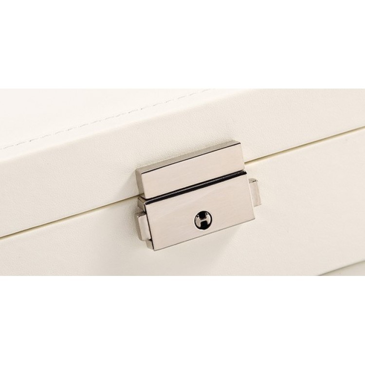 • Верхній рівень має зручне поворотне дзеркало, розташоване на верхній кришці. Крім того, там розташований відділ з валиками для кілець, 2 відділи для годинників, браслетів та інших невеликих цінностей.
