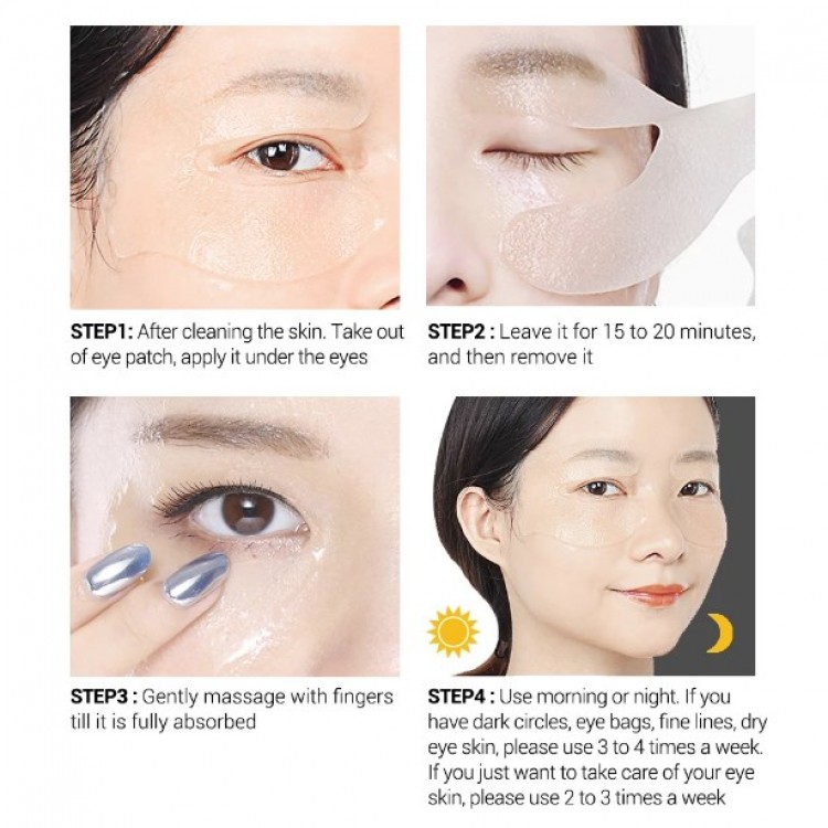 Застосування: очищаємо шкіру навколо очей, накладаємо патч на суху шкіру нижньої повіки за допомогою спеціальної пластикової лопатки і злегка поплескувати по ньому для щільного прилягання. Ми залишаємо для впливу протягом від 15 до 30 хвилин. Знімаємо патч, залишки рідини легкими рухами розподіляємо навколо очей. Після зняття патча слід нанести сироватку або крем на повіки.