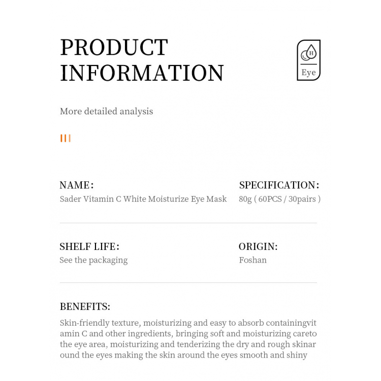 SADOER Vitamin C White Moisturize Eye Mask створені для інтенсивного живлення та освітлення шкіри навколо очей. Завдяки екстракту апельсину та кристалічному колагену, ці патчі забезпечують зволоження, підвищення еластичності шкіри та зменшення темних кіл і набряків. Ідеальний засіб для боротьби з ознаками втоми та стресу, роблячи ваш погляд яскравим і свіжим.