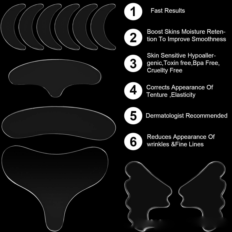 Комплект силіконових патчів призначений для боротьби зі зморшками та покращення еластичності шкіри. У наборі є патчі для різних зон обличчя, шиї та декольте, які допомагають зволожувати шкіру, розгладжувати зморшки та покращувати її текстуру.