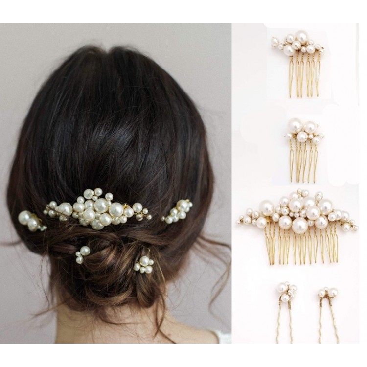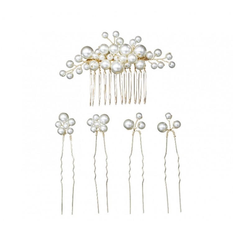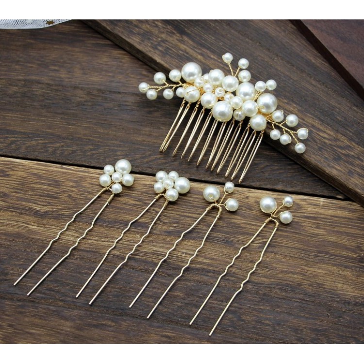 Красивые шпильки с жемчугом для волос, станут отличным приобретением, поскольку набор состоит из 4 шпилек и 1 расчески, что позволит сделать красивую прическу где угодно.