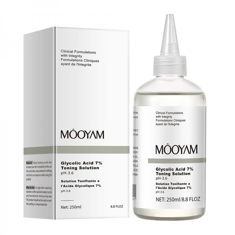 Mooyam Glycolic Acid 7% Toning Solution – это эффективное средство для эксфолиации кожи, помогающее улучшить ее текстуру, выровнять тон и придать свежесть. Благодаря 7% гликолевой кислоте средство мягко отшелушивает ороговевшие клетки, стимулирует обновление кожи и способствует разглаживанию морщин.
