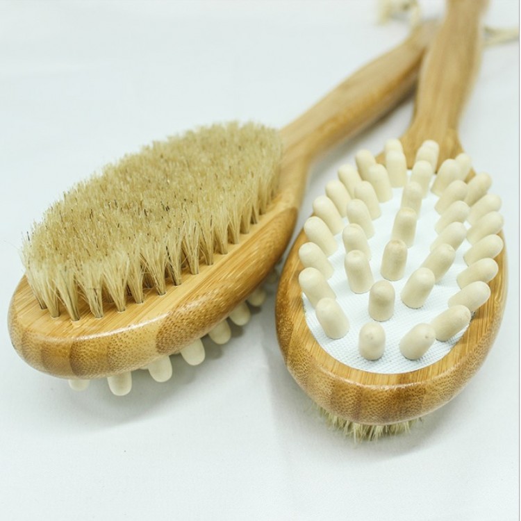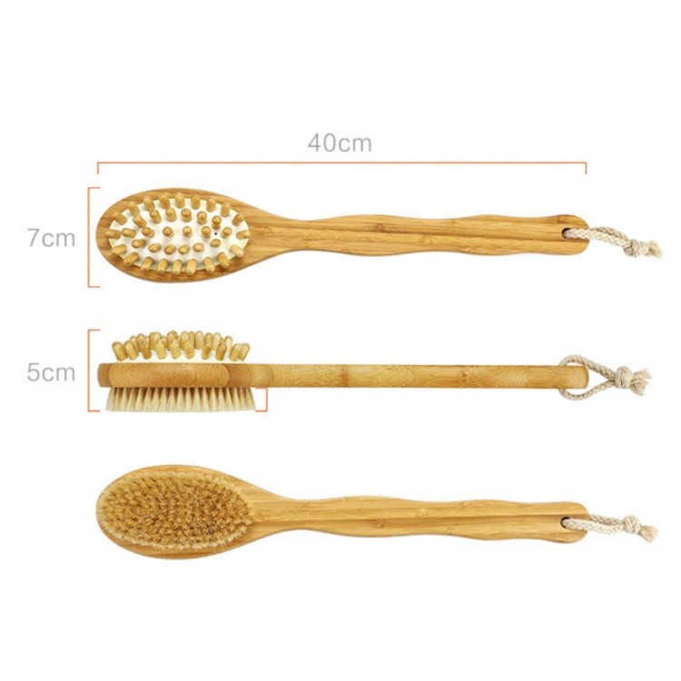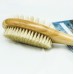 Двостороння щітка з натурального волокна. Ідеально підходить для щоденного догляду за тілом. Дерев'яна, міцна рукоятка забезпечує зручне використання. М'яка щітка очищає шкіру від мертвої шкіри, а дерев'яні наконечники приємно масажують шкіру, тим самим стимулюючи циркуляцію і знімаючи м'язові напруги. Щітка для сухого масажу виготовлена з натуральних матеріалів. Натуральна щетина допомагає боротися з целюлітом, старінням шкіри, тонізує її і відлущує омертвілі клітини шкіри.