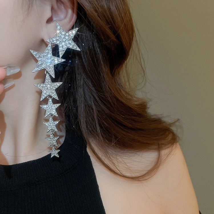 Сережки-голки виконані у формі п’ятикутних зірок різного розміру, інкрустованих блискучими стразами, що переливаються на світлі і додають образу вишуканості. Кожна сережка прикрашена довгою китицею, яка підкреслює витонченість та легкість рухів. Завдяки довжині 13 см вони створюють ефектну динаміку, привертають погляд та чудово доповнюють будь-який образ.