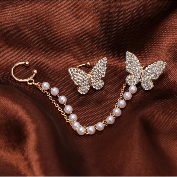 Ця вишукана сережка прикрашена золотистим метеликом, інкрустованим кристалами, та ланцюжком з перлин, що додає образу нотку грації та жіночності.