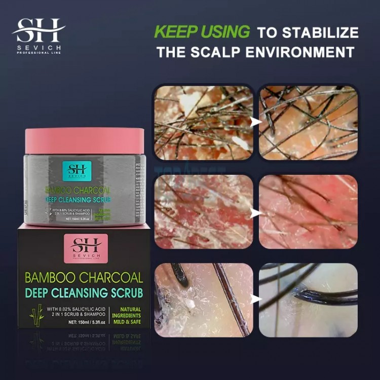 Sevich Bamboo Charcoal Deep Cleansing Scrub — це інноваційний засіб для глибокого очищення шкіри голови та волосся, збагачений активованим бамбуковим вугіллям і саліциловою кислотою. Завдяки природним компонентам, скраб ефективно видаляє забруднення, токсини та надлишки шкірного жиру, залишаючи шкіру голови свіжою та здоровою. Бамбукове вугілля проникає глибоко у пори, витягаючи забруднення, а саліцилова кислота допомагає боротися з проблемами шкіри голови, такими як лупа та подразнення.