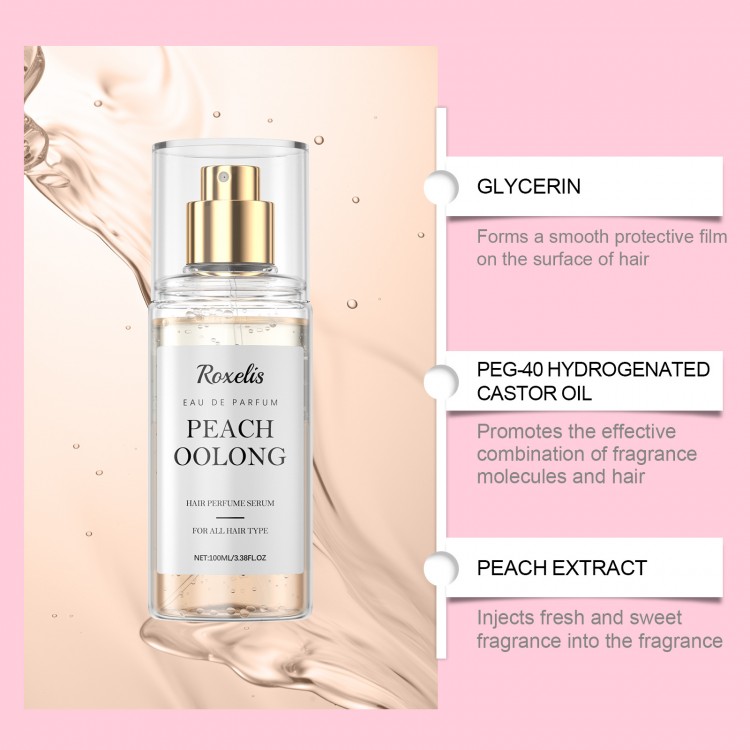 Фруктовий парфумований спрей Roxelis Peach Oolong — це не просто спрей, а багатофункціональний б’юті-продукт, який поєднує ароматизацію і догляд. У його складі — гліцерин, що зволожує шкіру та волосся, касторова олія, яка надає блиску й м’якості, а також екстракт персику, відомий своїми поживними властивостями. Завдяки цим компонентам спрей не лише приємно пахне, а й піклується про ваше волосся та тіло, залишаючи його зволоженим і доглянутим.