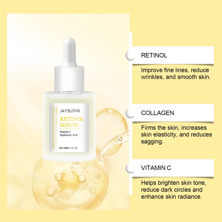 Jaysuing Retinol Serum — високоефективна сироватка для відновлення шкіри обличчя, яка містить ретинол, вітамін Е та гіалуронову кислоту. Засіб спрямований на боротьбу зі зморшками, покращення пружності та еластичності шкіри, а також забезпечує глибоке зволоження. Сироватка стимулює регенерацію клітин та надає шкірі здорового сяйва.