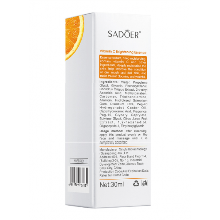 SADOER Vitamin C Brightening Essence — це концентрована сироватка для освітлення та відновлення шкіри. Завдяки свіжому екстракту апельсина, продукт сприяє вирівнюванню тону обличчя, освітлює пігментні плями та повертає шкірі природне сяйво. Есенція також зволожує шкіру, роблячи її гладкою та пружною.